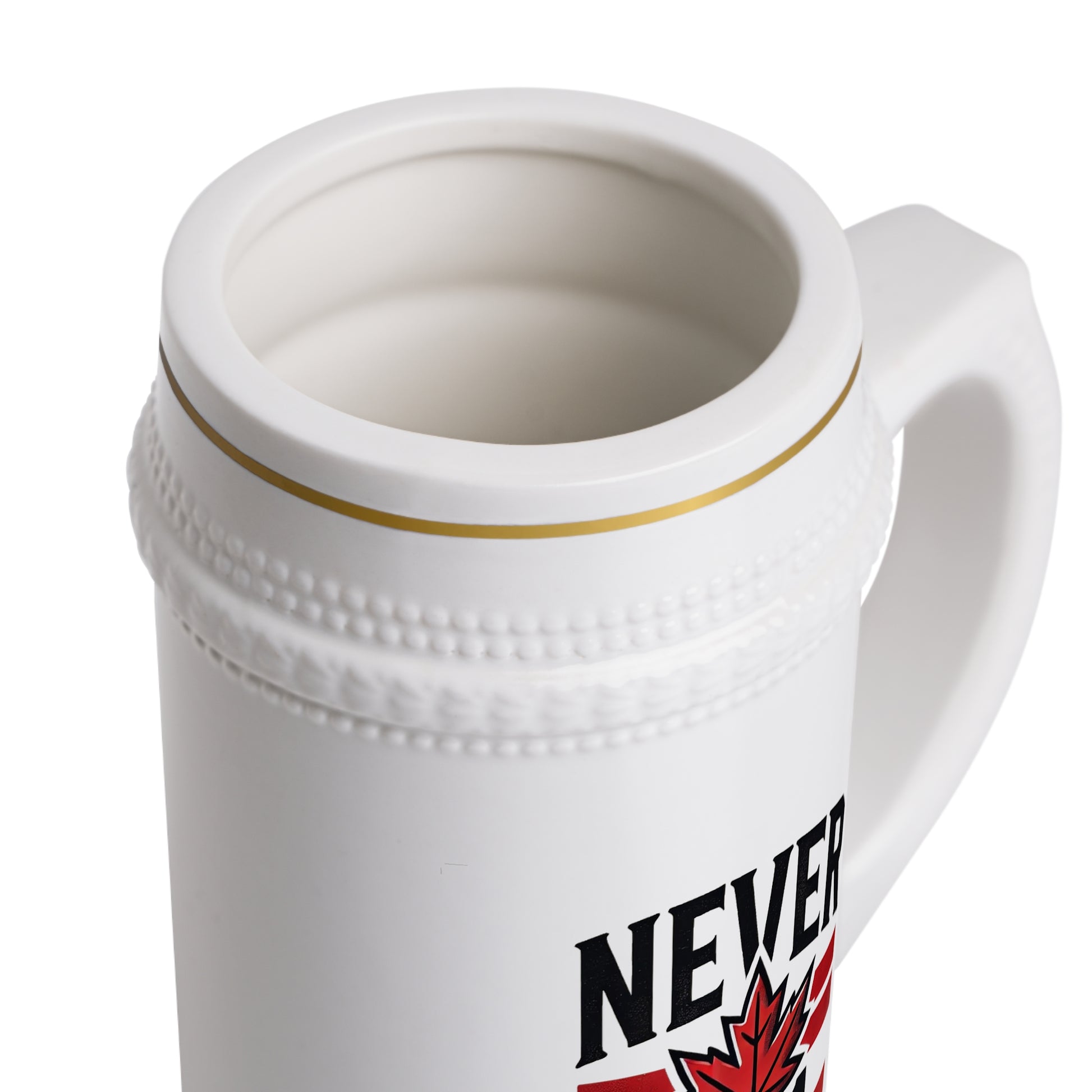 Because your beer deserves better, here is our True North, Never South design on our 650ml Pint Plus sized beer stein. After a long day on the ice, nothing goes down like a cold brew, and now you can save yourself reaching into the cooler as much with this Stein. Made with durable white ceramic material, these stein mugs are both scratch-resistant for long-lasting looks, and dishwasher-safe for convenient cleaning.